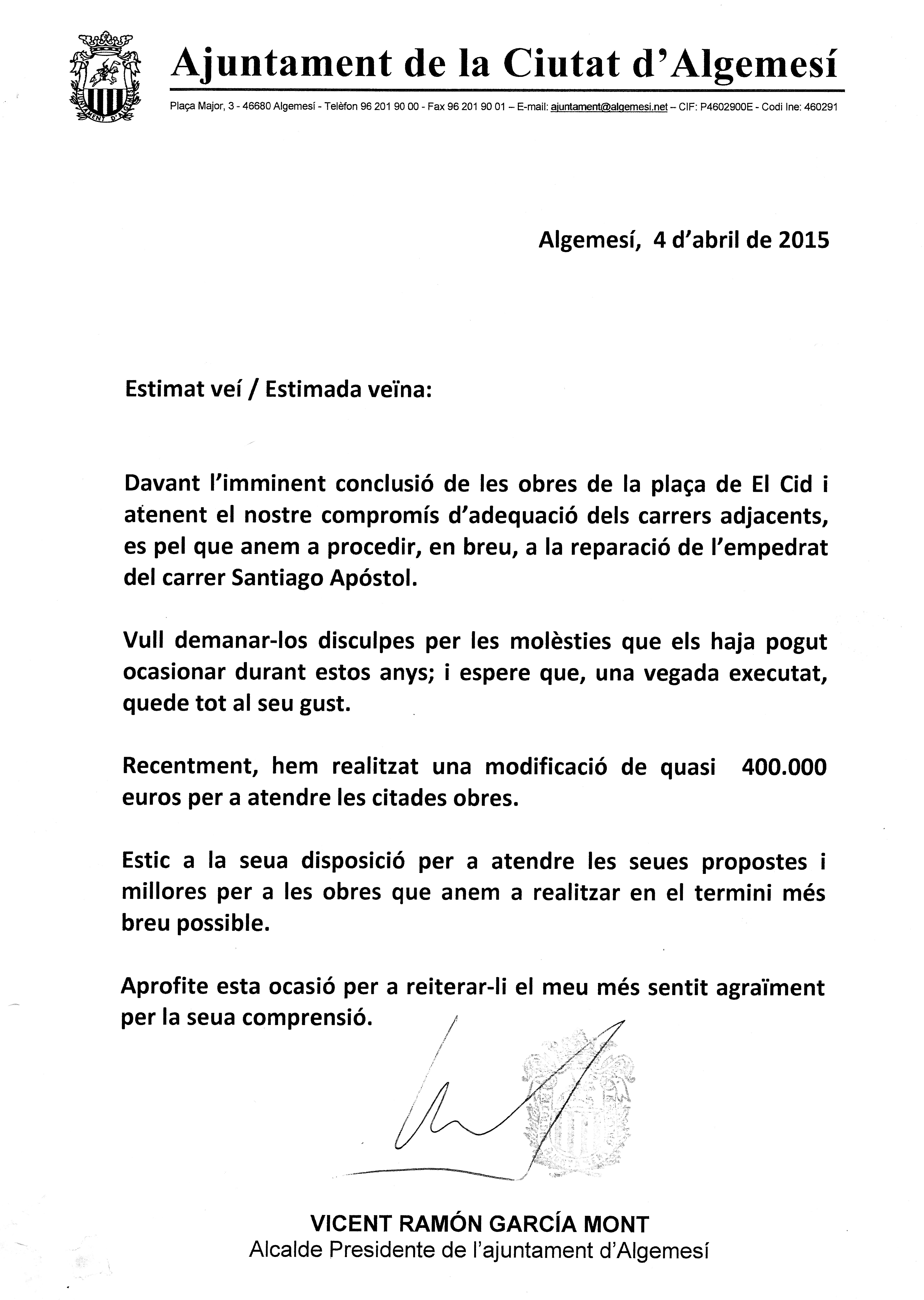 En el dia d’ahir el veïnat del carrer Cervantes reberen propaganda institucional de l’ajuntament, amb escut oficial i la signatura de l’Alcalde, indicant que davant “l’imminent conclusió de les obres del mercat” anaven a procedir a l’empredat de l’esmentat carrer. D’entrada l’acabament no és tan imminent, ja que està previst per a setembre, i segon lloc aquest tipus de campanyes institucionals estan prohibides des del dia 31 de març.. Però no contents amb això, han enviat un escrit igual al veïnat del carrer Sant Jaume Apòstol en relació a les obres de la plaça del Cid. M+S ALGEMESÍ considera que això és clarament joc brut del PP d’Algemesí. Tant l’article 50.2 de la Llei Electoral (LOREG), com la instrucció 2/2011 de la Junta Electoral Central (JEC) indiquen que les institucions públiques no poden enviar fulls, sms, publicitat, missatges ni res semblant que “continguen al·lusions als èxits obtinguts per qualsevol poder públic”. La poca vergonya del PP d’Algemesí fa que ja no tinguen prou en “tirar-se flors” per les obres fetes, sinó que se les tiren d’allò que es farà en la següent legislatura, en la qual no saben ni si estaran en el govern. Amb diners públics paguen propaganda subliminar per al seu partit.